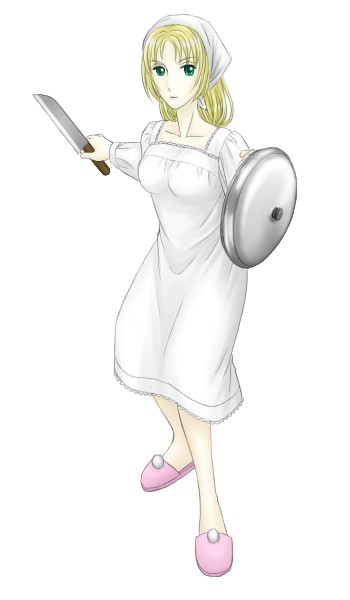 人妻のコスチュームと言えばエプロンか割烹着。武器は包丁と鍋蓋。
